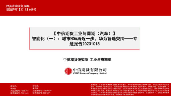 【中信期货】【20231018】【中信期货工业与周期(汽车)】专题报告:智能化(一),城市NOA再近一步,华为智选突围-22页 行业研究