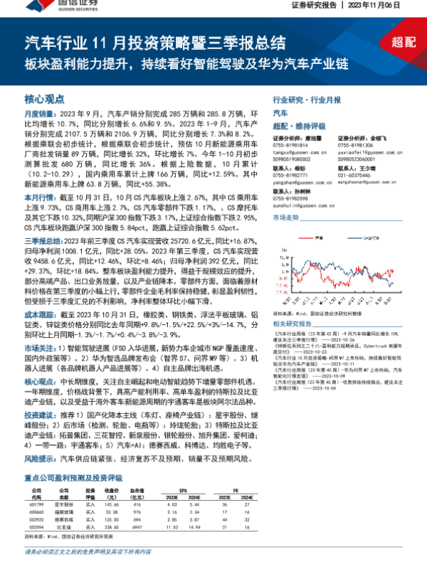【国信证券】【20231106】20231106-国信证券-汽车行业11月投资策略暨三季报总结:板块盈利能力提升,持续看好智能驾驶及华为汽车产业链-38页 行业研究