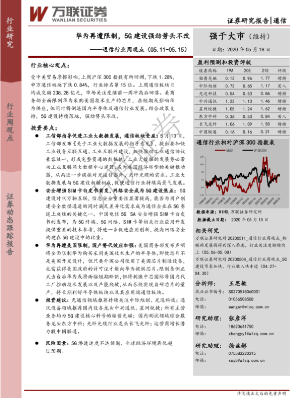 【万联证券】【20200518】20200518-万联证券-通信行业周观点:华为再遭限制,5G建设强劲势头不改-12页 行业研究