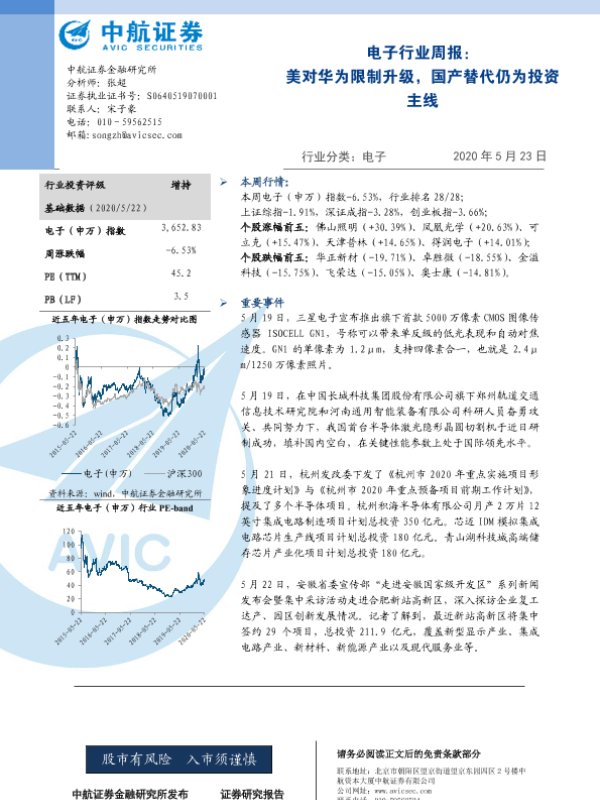 【中航证券】【20200523】电子行业周报:美对华为限制升级,国产替代仍为投资主线-4页 行业研究
