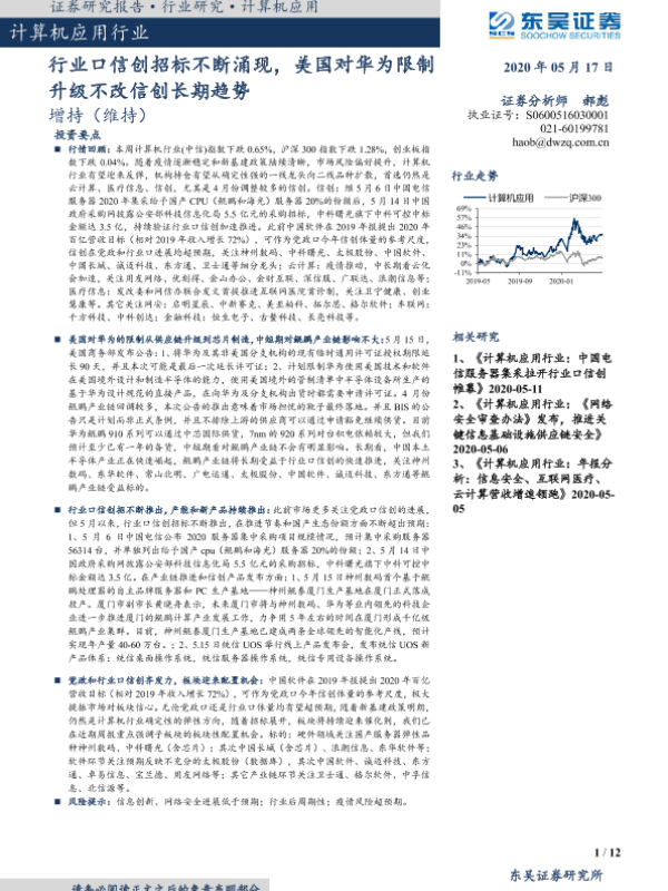 【东吴证券】【20200517】计算机应用行业:行业口信创招标不断涌现,美国对华为限制升级不改信创长期趋势-12页 行业研究
