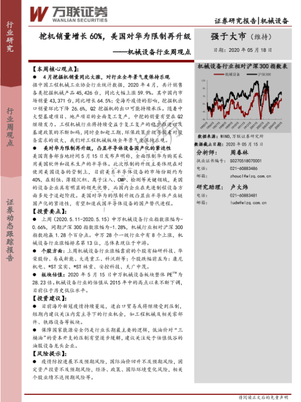 【万联证券】【20200518】20200518-万联证券-机械设备行业周观点:挖机销量增长60%,美国对华为限制再升级-8页 行业研究