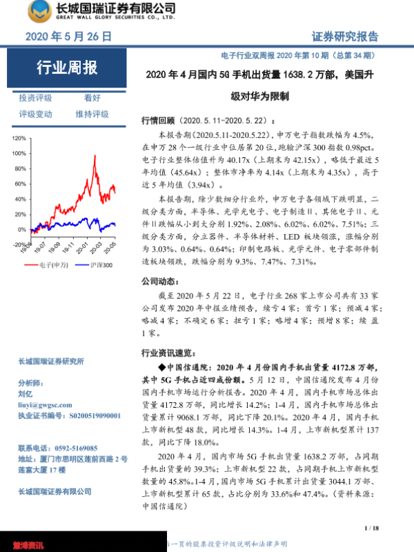 【长城国瑞证券】【20200526】电子行业双周报2020年第10期(总第34期):2020年4月国内5G手机出货量1638.2万部,美国升级对华为限制-18页 行业研究
