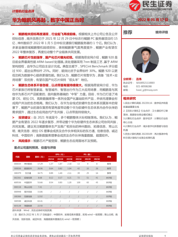 【民生证券】【20220117】计算机行业点评:华为鲲鹏风再起,数字中国正当时-2页 行业研究