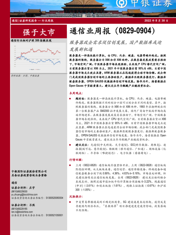【中银证券】【20220830】通信业周报:服务器政企需求促信创发展,国产数据库或迎发展新机遇-29页 行业研究