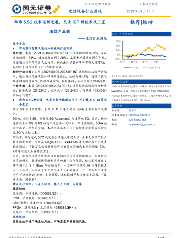【国元证券】【20230915】通信行业周报:华为5.5G技术迎新进展,关注ICT新技术及卫星通信产业链-11页 行业研究