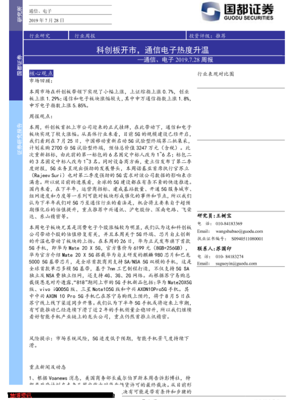 【国都证券】【20190728】20190728-国都证券-通信、电子周报:科创板开市,通信电子热度升温-3页 行业研究