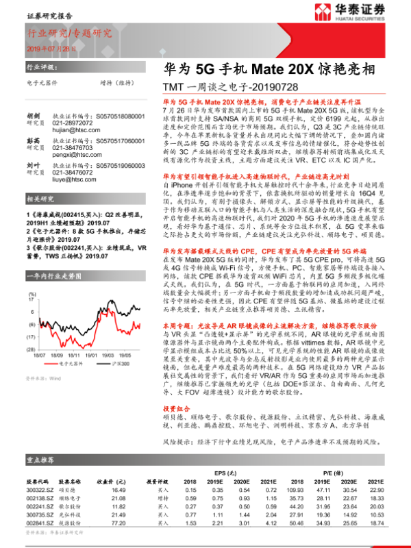 【华泰证券】【20190728】TMT一周谈之电子:华为5G手机Mate 20X惊艳亮相-14页 行业研究