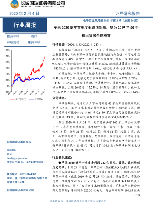 【长城国瑞证券】【20200204】电子行业双周报2020年第2期(总第26期):苹果2020财年首季度业绩创新高,华为2019年5G手机出货居全球榜首-20页 行业研究