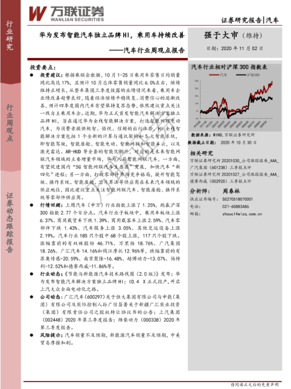 【万联证券】【20201102】20201102-万联证券-汽车行业周观点报告:华为发布智能汽车独立品牌HI,乘用车持续改善-11页 行业研究