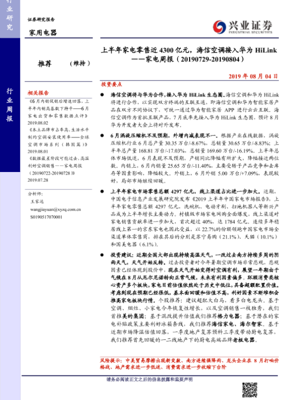 【兴业证券】【20190804】上半年家电零售近 4300亿元,海信空调接入华为HiLink——家电周报(20190729-20190804)-10页 行业研究