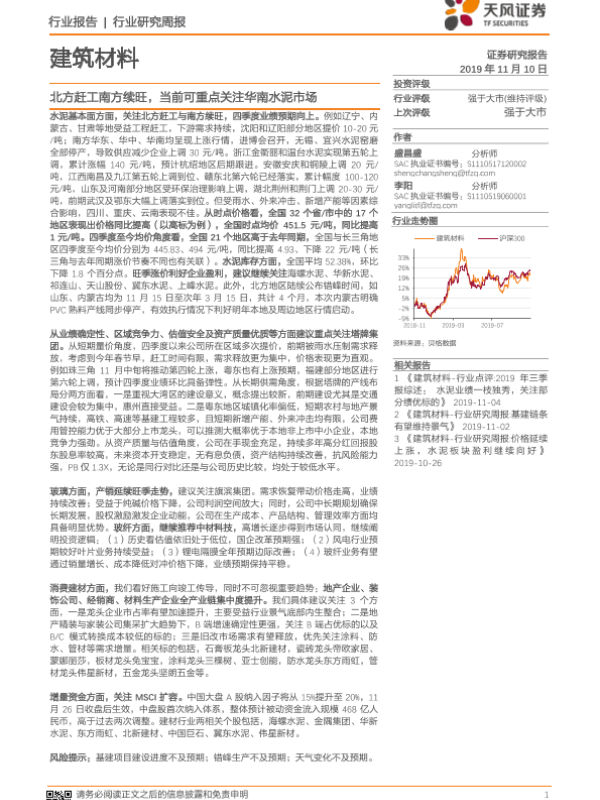 【天风证券】【20191110】建筑材料行业研究周报:北方赶工南方续旺,当前可重点关注华南水泥市场-10页 行业研究