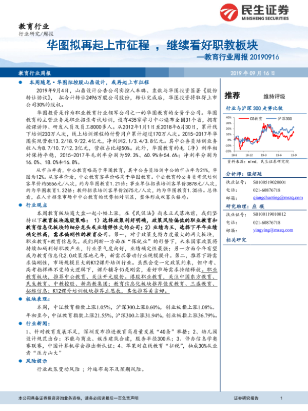 【民生证券】【20190916】20190916-民生证券-教育行业周报:华图拟再起上市征程,继续看好职教板块-11页 行业研究