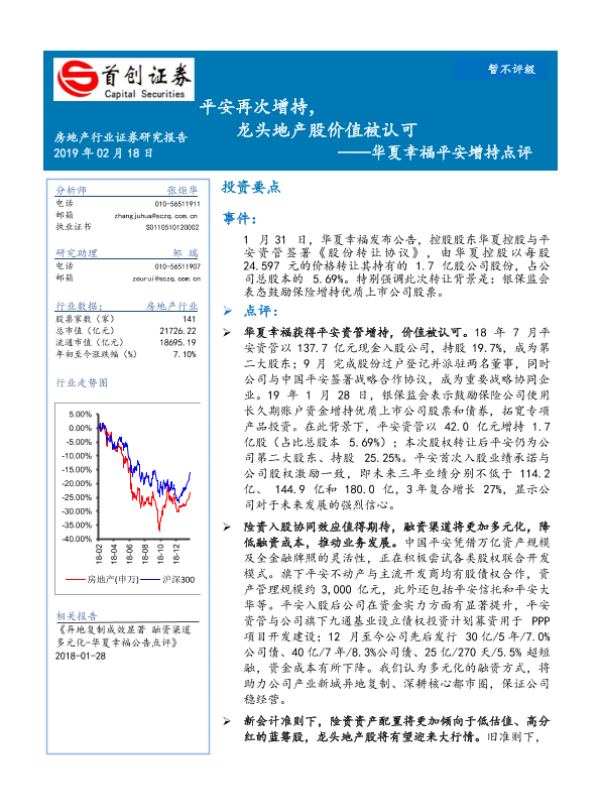 【首创证券】【20190218】华夏幸福平安增持点评:平安再次增持,龙头地产股价值被认可-3页 行业研究