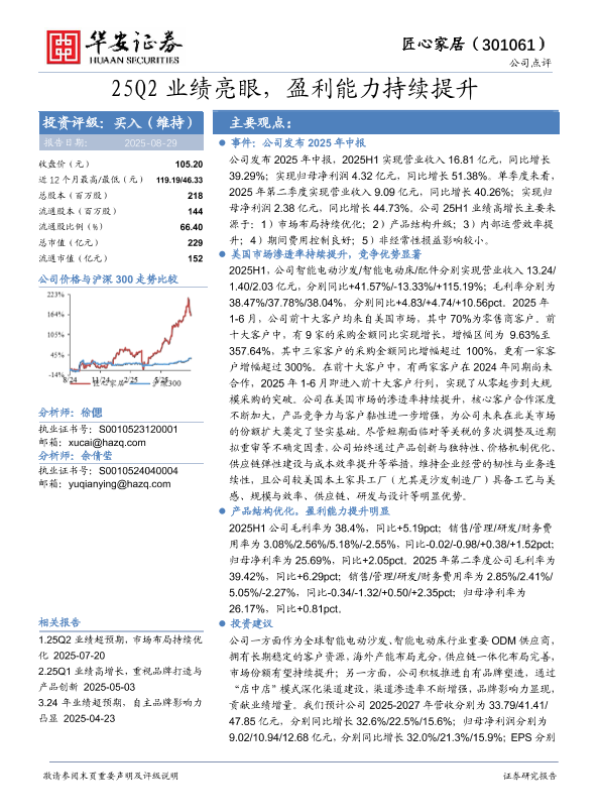 【华安证券】【20250829】匠心家居-25Q2业绩亮眼,盈利能力持续提升-4页 证券期货研究报告