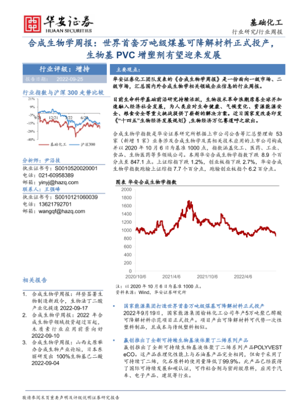 【华安证券】【20220925】合成生物学周报:世界首套万吨级煤基可降解材料正式投产,生物基PVC增塑剂有望迎来发展-22页 行业研究