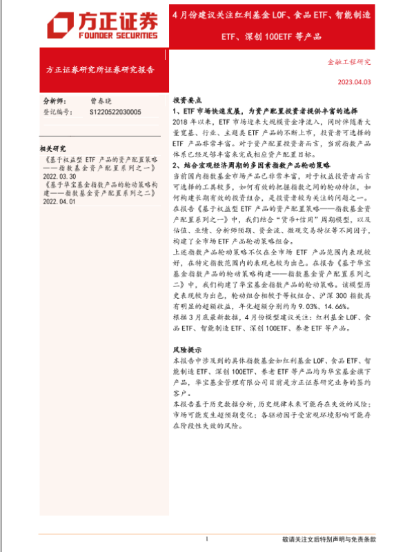 【方正证券】【20230403】4月份建议关注红利基金LOF、食品ETF、智能制造ETF、深创100ETF等产品-21页 行业研究