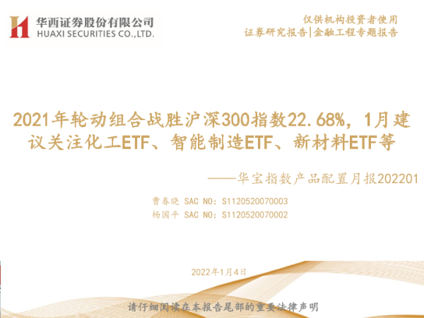 【华西证券】【20220104】品配置月报:2021年轮动组合战胜沪深300指数22.68%,1月建议关注化工ETF、智能制造ETF、新材料ETF等-24页 行业研究