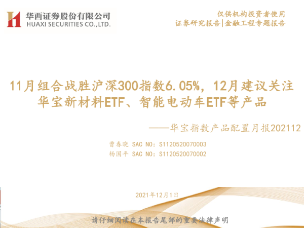【华西证券】【20211201】华宝指数产品配置月报:11月组合战胜沪深300指数6.05%,12月建议关注华宝新材料ETF、智能电动车ETF等产品-24页 行业研究