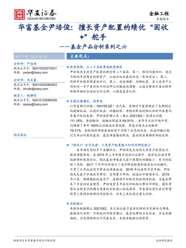 【华安证券】【20210810】基金产品分析系列之六:华富基金尹培俊,擅长资产配置的绩优“固收+”舵手-18页 行业研究