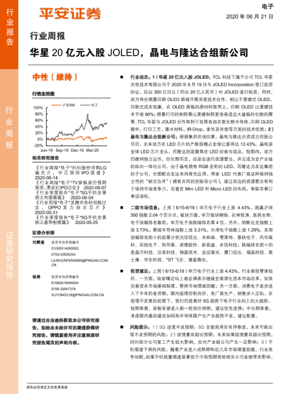 【平安证券】【20200621】20200621-平安证券-电子行业周报:华星20亿元入股JOLED,晶电与隆达合组新公司-5页 行业研究