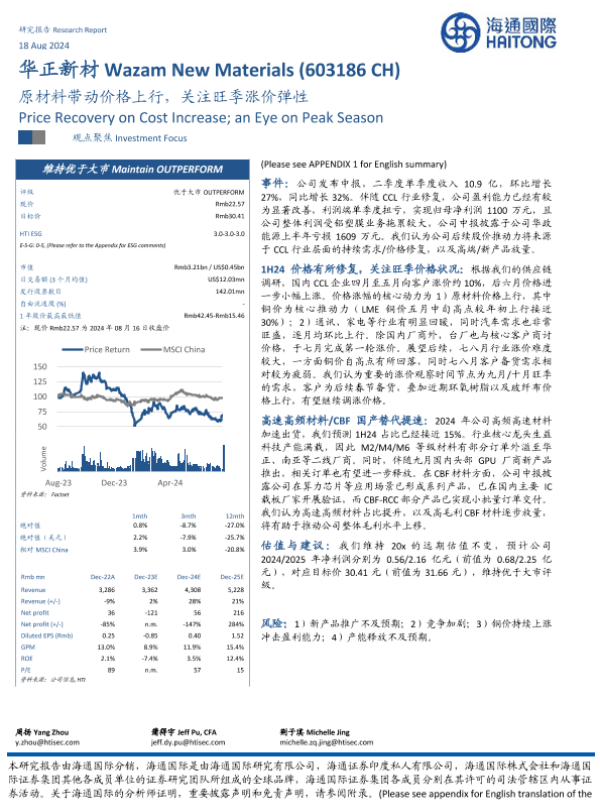 【海通国际】【20240818】华正新材(603186)原材料带动价格上行,关注旺季涨价弹性-14页 行业研究