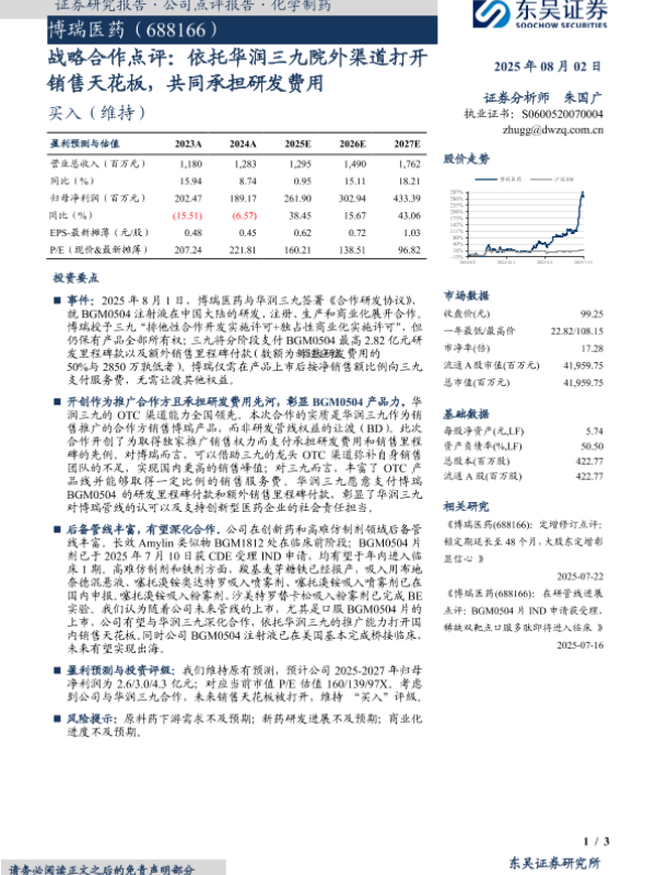 【东吴证券】【20250802】博瑞医药战略合作点评:依托华润三九院外渠道打开销售天花板,共同承担研发费用-3页 证券期货研究报告
