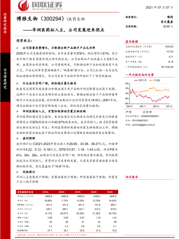 【国联证券】【20210707】博雅生物(300294)—华润医药拟入主,公司发展迎来拐点-20页 行业研究