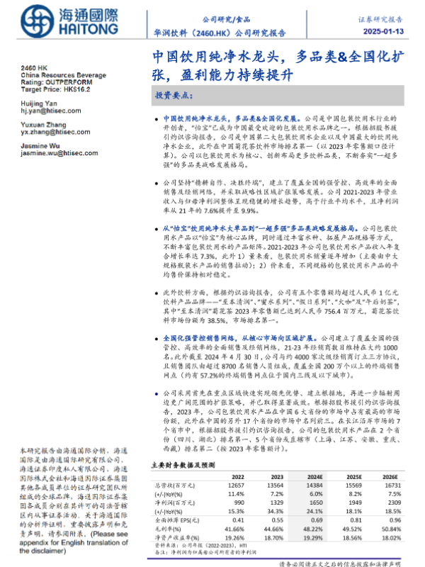 【海通国际】【20250113】华润饮料(02460.HK)中国饮用纯净水龙头,多品类、全国化扩张,盈利能力持续提升-39页 行业研究