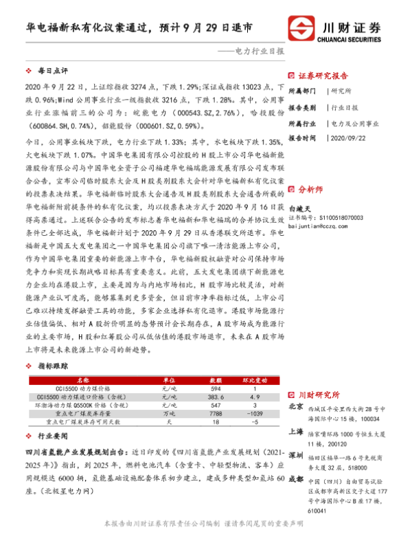 【川财证券】【20200922】电力行业日报:华电福新私有化议案通过,预计9月29日退市-3页 证券期货研究报告