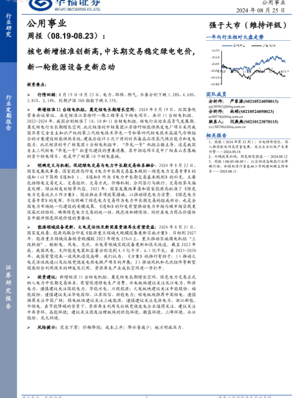 【华福证券】【20240825】公用事业周报:核电新增核准创新高,中长期交易稳定绿电电价,新一轮能源设备更新启动-18页 行业研究