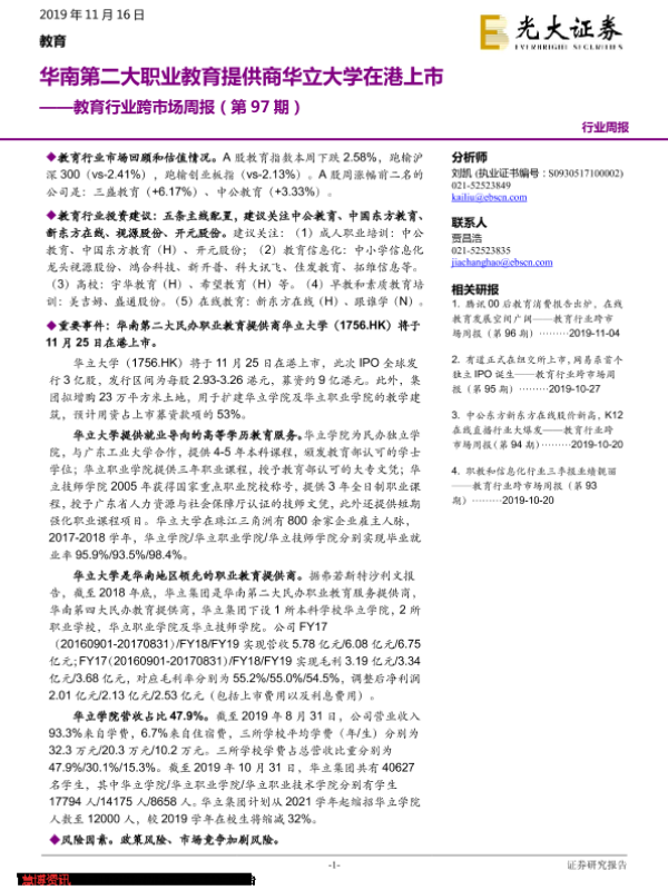 【光大证券】【20191116】教育行业跨市场周报(第97期):华南第二大职业教育提供商华立大学在港上市-17页 行业研究