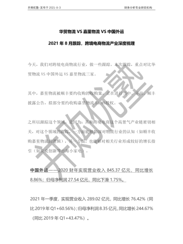 【并购优塾】【20210803】2021年8月跟踪,跨境电商物流产业深度梳理:华贸物流VS嘉里物流VS中国外运-32页 行业研究