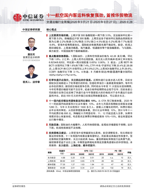 【中信证券】【20200928】十一航空国内客运料恢复强劲,首推华贸物流-23页 行业研究