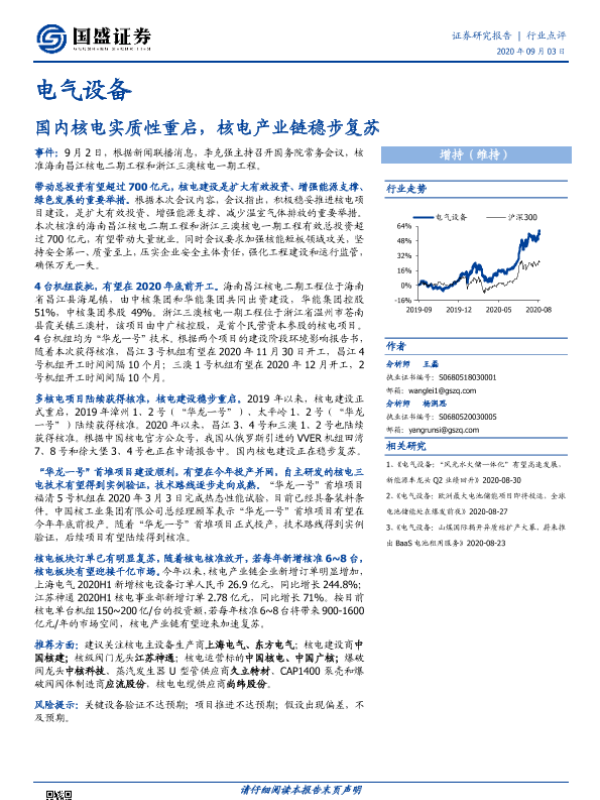 【国盛证券】【20200903】国内核电实质性重启,核电产业链稳步复苏-3页 行业研究
