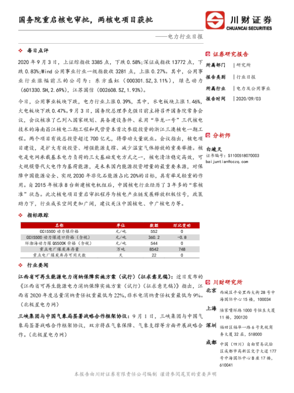 【川财证券】【20200903】电力行业日报:国务院重启核电审批,两核电项目获批-3页 证券期货研究报告
