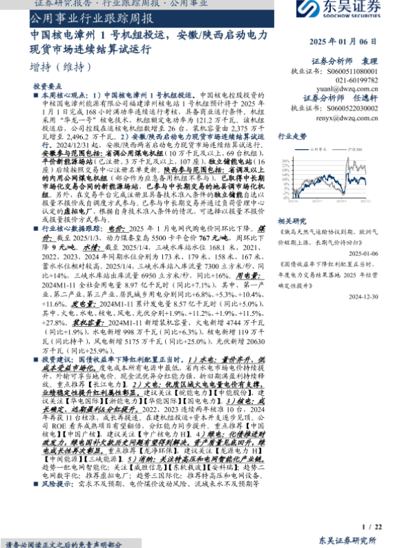 【东吴证券】【20250106】公用事业行业跟踪周报:中国核电漳州1号机组投运,安徽陕西启动电力现货市场连续结算试运行-22页 行业研究