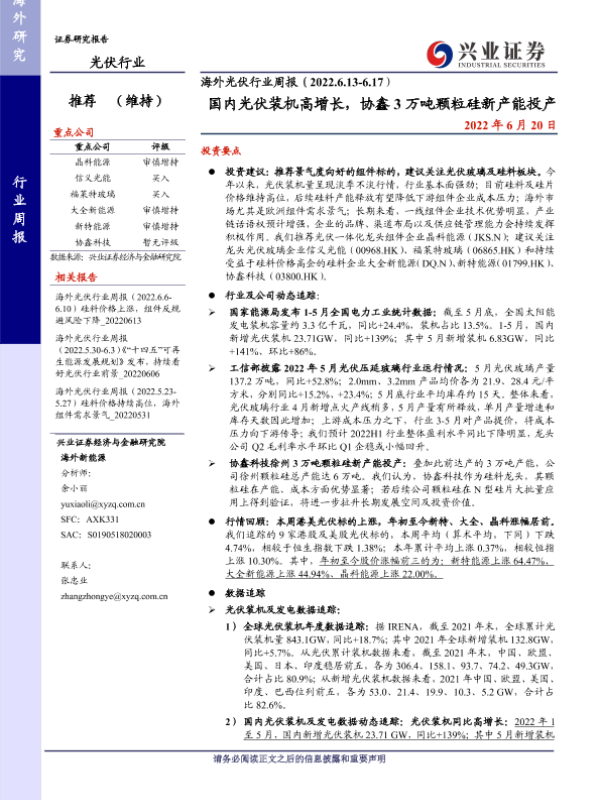 【兴业证券】【20220620】海外光伏行业周报(2022.6.13-6.17):国内光伏装机高增长,协鑫3万吨颗粒硅新产能投产-22页 行业研究