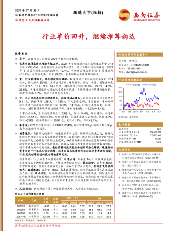 【西南证券】【20210720】快递行业6月份数据点评:行业单价回升,继续推荐韵达-11页 行业研究
