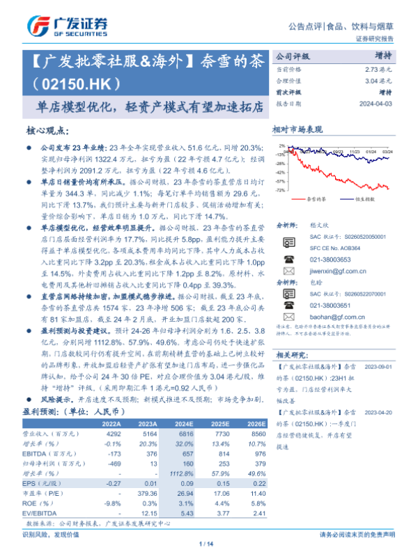 【广发证券】【20240403】奈雪的茶 (02150.HK)单店模型优化,轻资产模式有望加速拓店-14页 行业研究