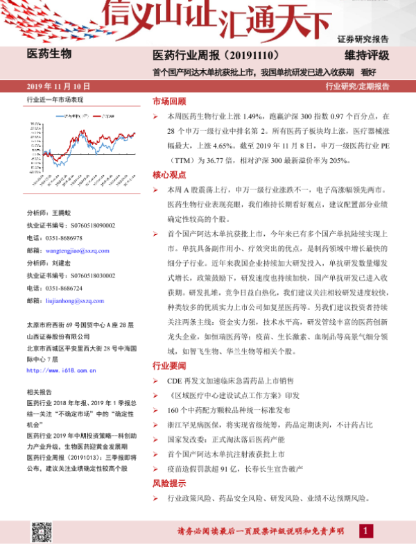 【山西证券】【20191110】医药生物行业周报:首个国产阿达木单抗获批上市,我国单抗研发已进入收获期-8页 行业研究