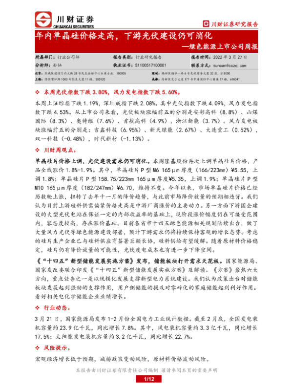 【川财证券】【20220327】20220327-川财证券-绿色能源上市公司周报:年内单晶硅价格走高,下游光伏建设仍可消化-12页 行业研究