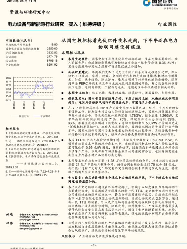 【国金证券】【20190811】20190811-国金证券-电力设备与新能源行业研究:从国电投招标看光伏组件技术走向,下半年泛在电力物联网建设将提速-4页 行业研究