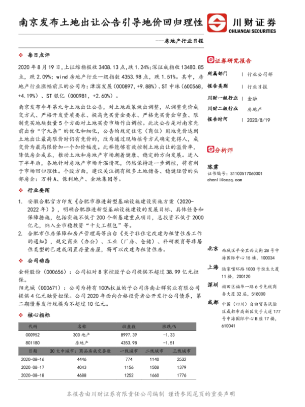 【川财证券】【20200819】南京发布土地出让公告引导地价回归理性-3页 证券期货研究报告