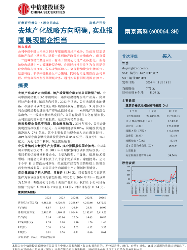 【中信建投证券】【20241118】南京高科(600064)去地产化战略方向明确,实业报国展现国企担当-18页 行业研究