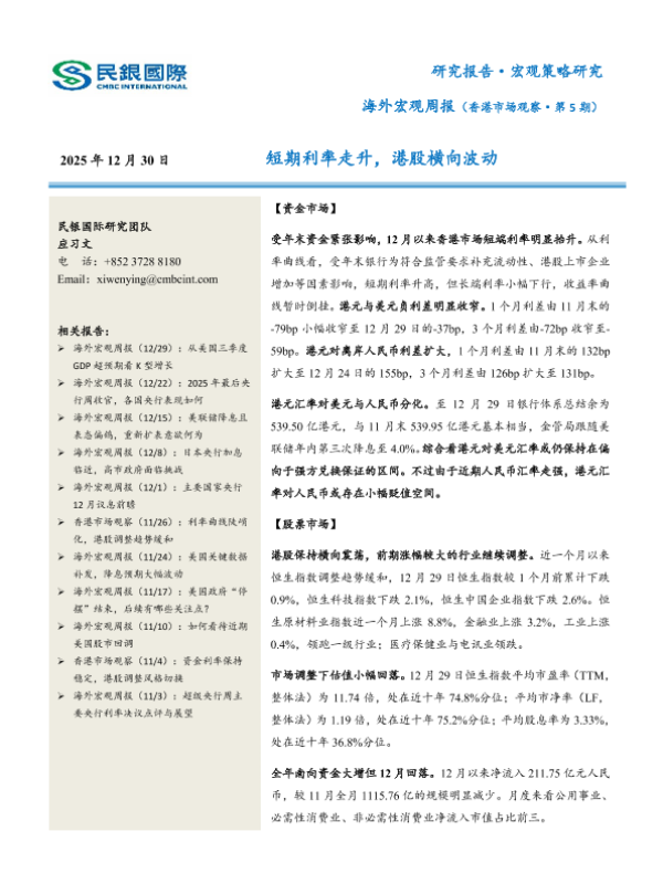 【民银国际研究团队】【202312】海外宏观周报(香港市场观察·第5期):短期利率走升,港股横向波动-9页 证券期货研究报告