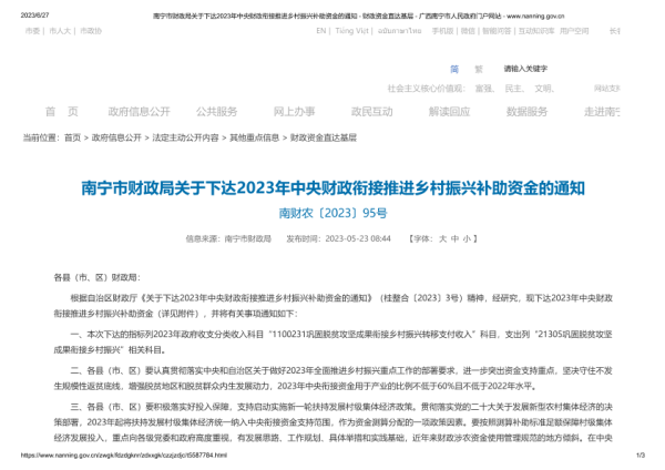 【南宁市财政局】【20230523】南宁市财政局关于下达2023年中央财政衔接推进乡村振兴补助资金的通知-3页 政策文件