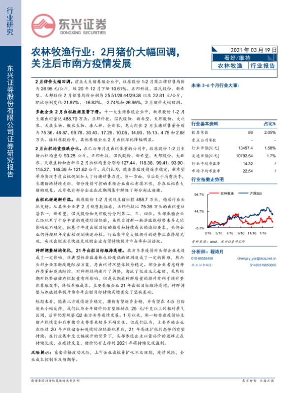 【东兴证券】【20210319】农林牧渔行业:2月猪价大幅回调,关注后市南方疫情发展-10页 行业研究