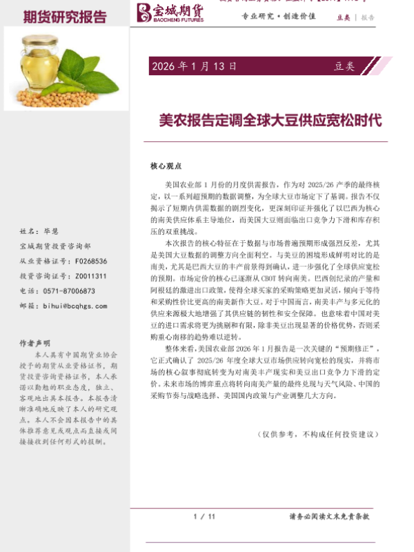 【宝城期货投资咨询部】【202601】美农报告定调全球大豆供应宽松时代-11页 证券期货研究报告