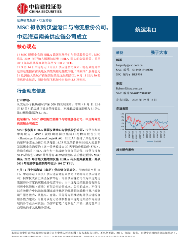 【中信建投证券】【20230918】航运港口行业:MSC拟收购汉堡港口与物流股份公司,中远海运南美供应链公司成立-27页 行业研究